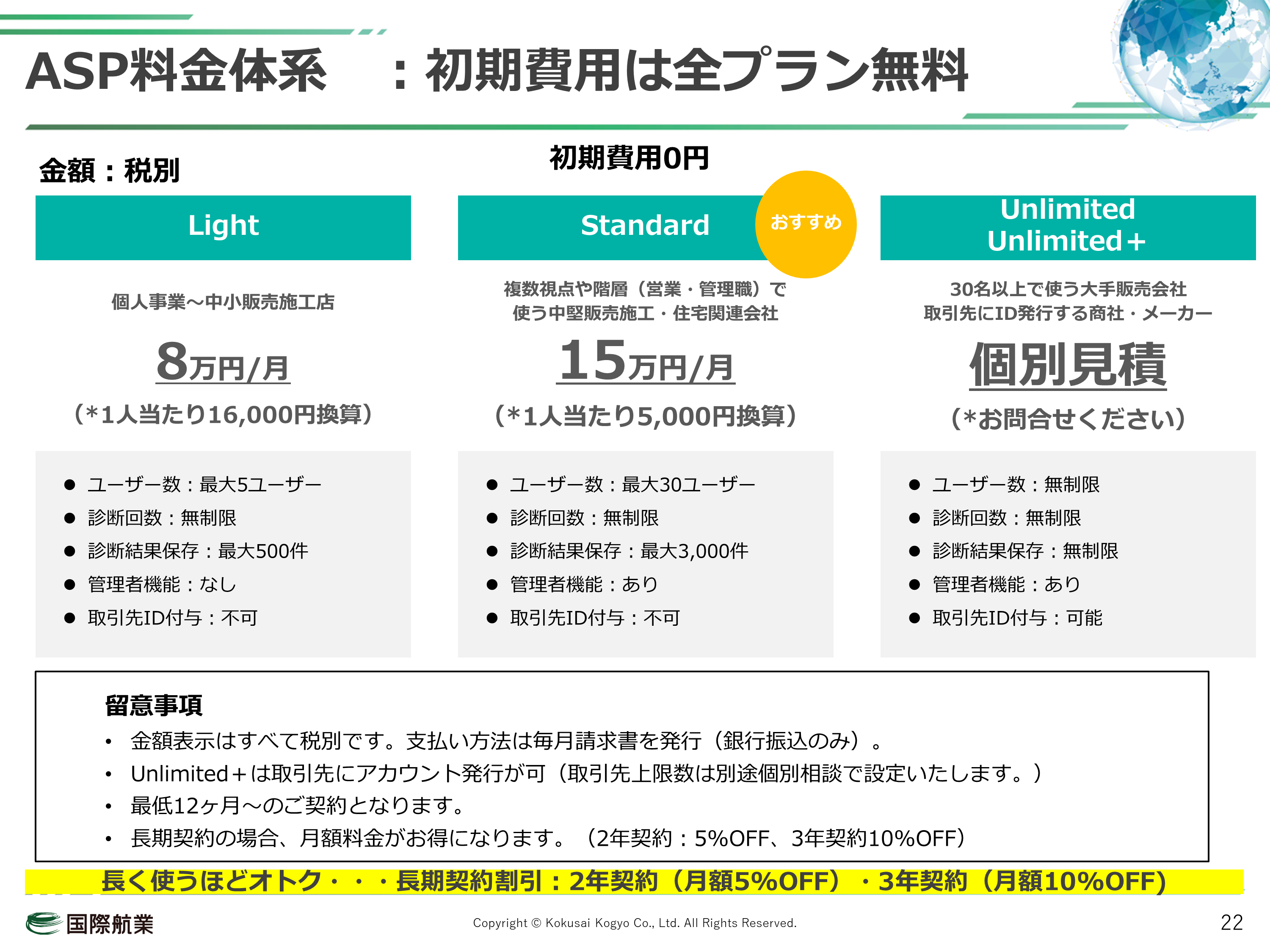 ・商社やメーカーの場合、販売会社にID付与できるUnlimited+プランもご用意。大手太陽光・蓄電池メーカーが採用。(自社蓄電システム製品のみがシミュレーションできるプラン。診断レポートのロゴは貴社ロゴに差し替え可)