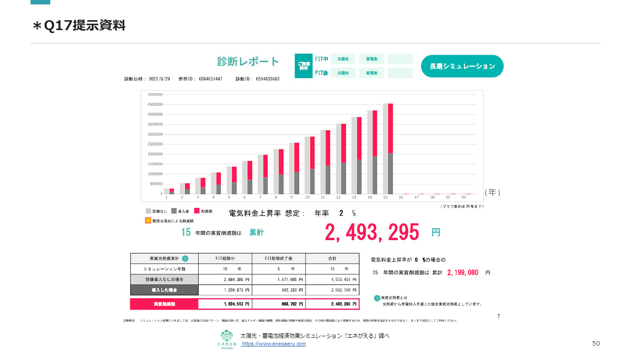 ・提示物:あり(※一部の設問でエネがえる経済効果シミュレーション診断レポートを提示して回答をもらった)