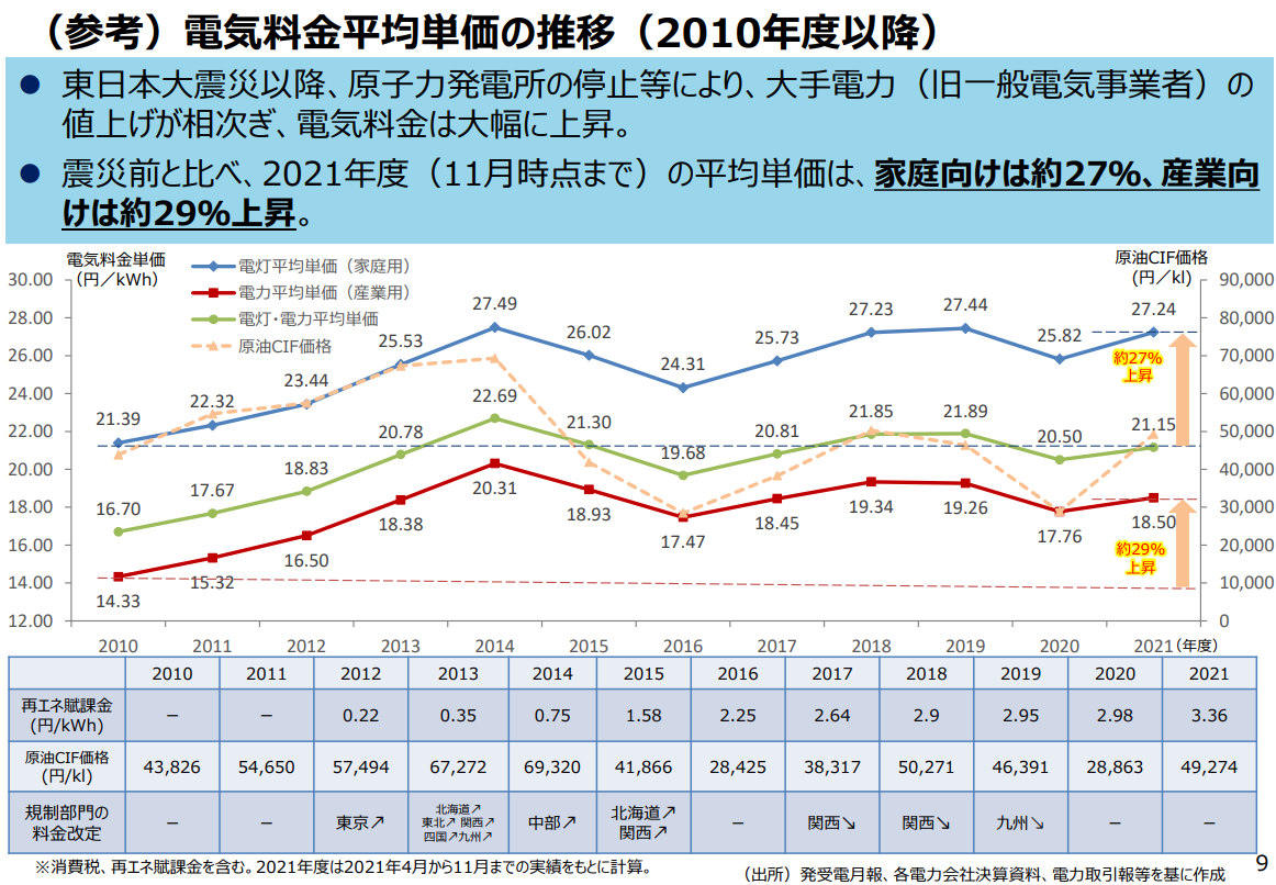 震災前(2010年)と比べ、2021年度(11月時点まで)の平均単価は、家庭向け(低圧電灯)は約27%上昇(※消費税、再エネ賦課金含む)→毎年平均だと2.45%~2.7%程度上昇している。