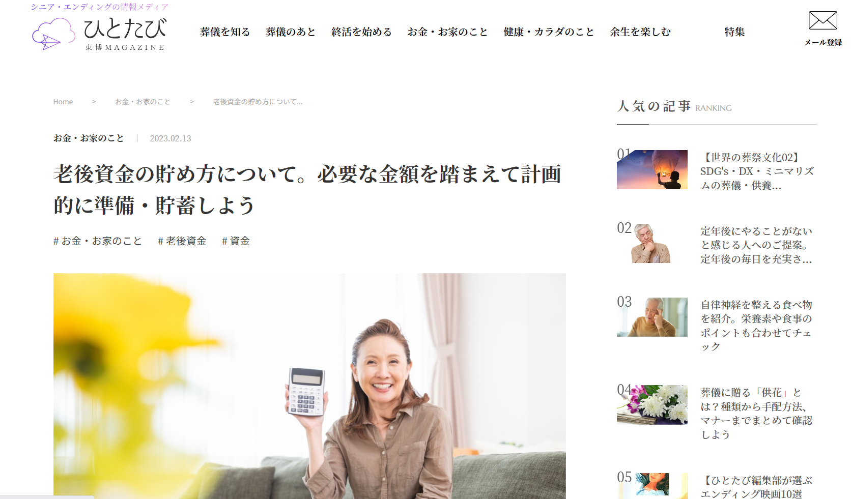 ひとたびは、シニア・エンディングの情報を探している方にピッタリな情報メディア。老後資金の貯め方についても情報が満載で、葬儀や終活、エンディングといった視点で質が高くわかりやすい特集コンテンツやブログ記事がチェックできます。