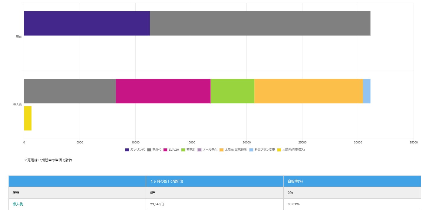電気自動車を購入するので、ガソリン代がかからなくなることと太陽光発電による節電と売電が見込める形に変わります。