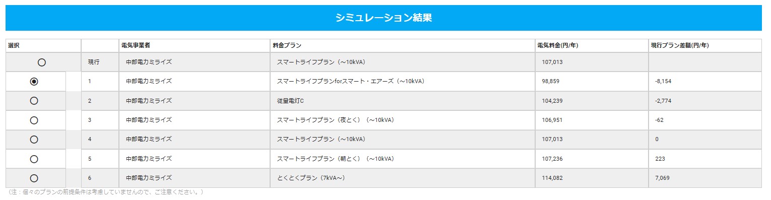 上のシミュレーション結果では、現行の中部電力の「スマートライフプラン(~10kVA)」から「スマートライフプランforスマート・エアーズ(~10kVA)」に切り替えることで年間8,154円の節電に繋がるということを表しています。
